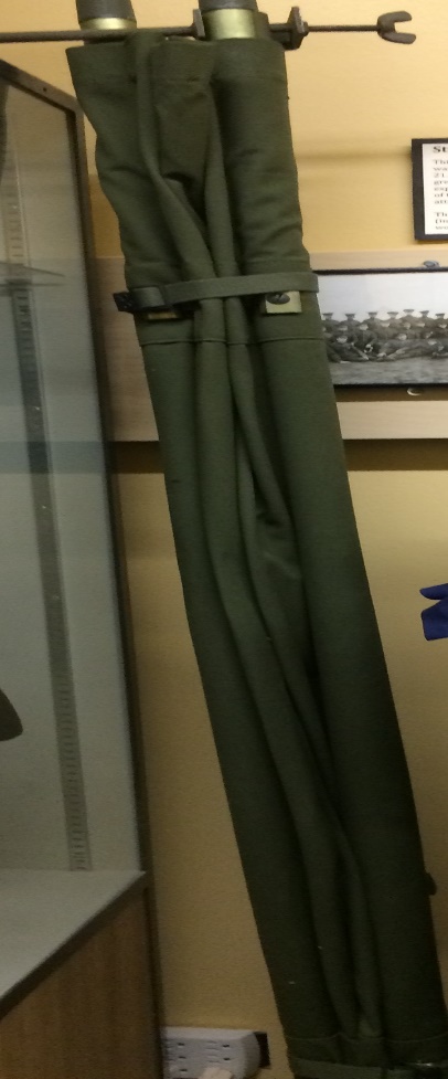 This First World War stretcher measures 93 ½” long x 22” wide. Mostly because of the wooden poles and metal attachments to them, it weighs almost 30 pounds. A stretcher or litter is carried by two or four stretcher (litter) bearers to evacuate the wounded at the first level/echelon of medical evacuation.